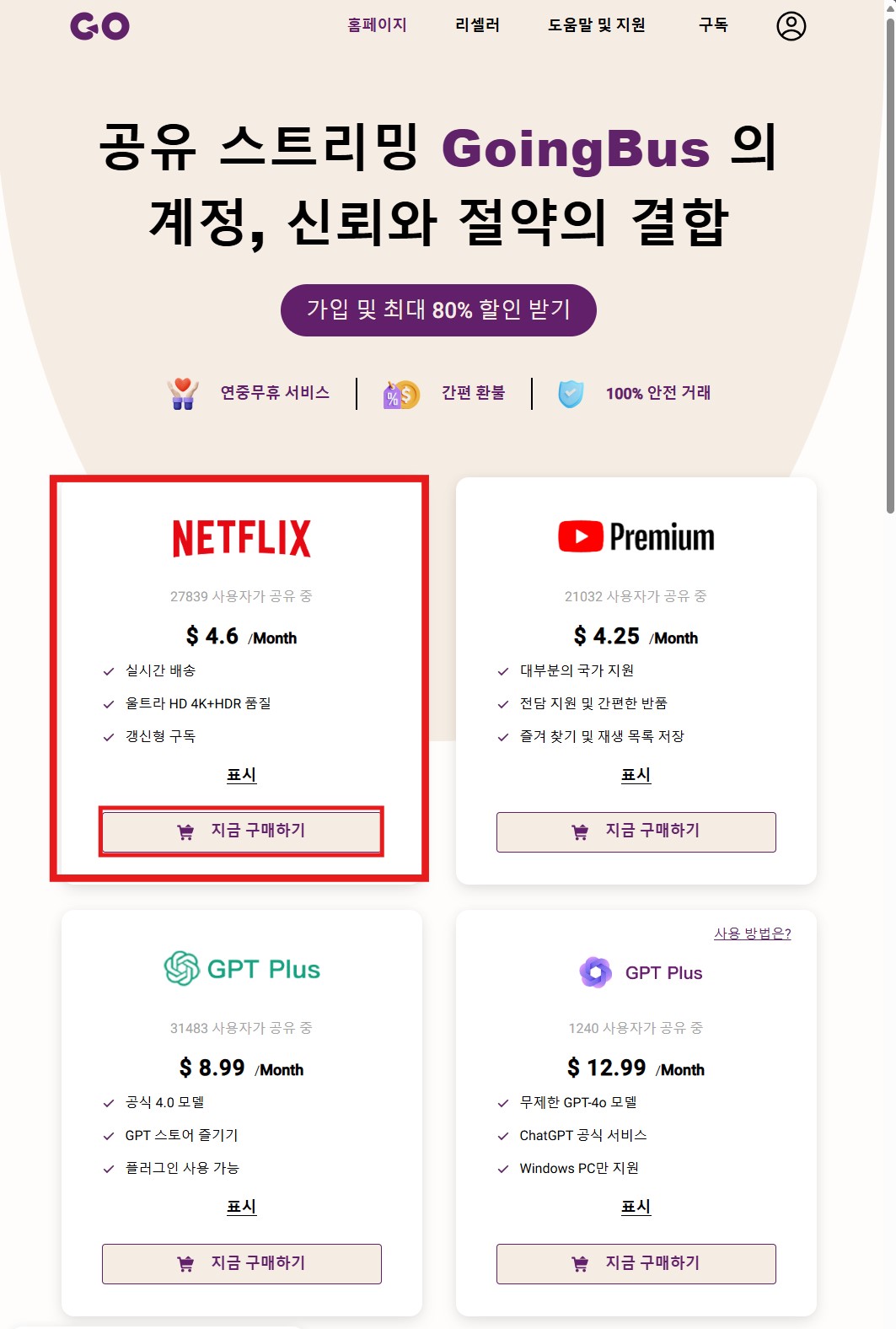 - 다양한 서비스: 넷플릭스뿐만 아니라 유튜브 프리미엄, 디즈니플러스, 스포티파이, 심지어 ChatGPT까지 다양한 서비스를 제공합니다.