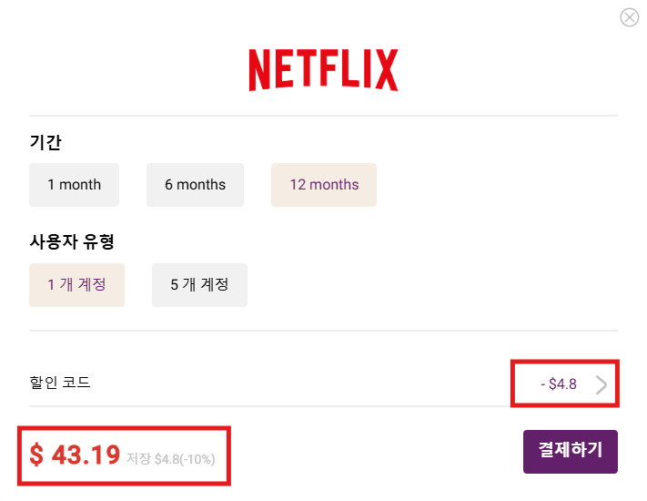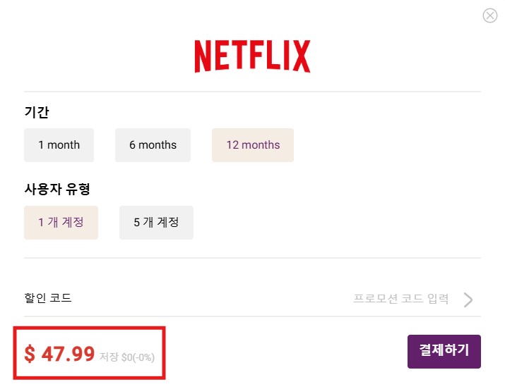 - 12개월 가입 기준에 할인코드 적용하지 않았을 때 47.99달러입니다. 즉, 한 달에 약 4달러 원화로 5,300백 원 정도 되는 금액으로 넷플릭스 프리미엄 서비스를 구독할 수 있는 것입니다.