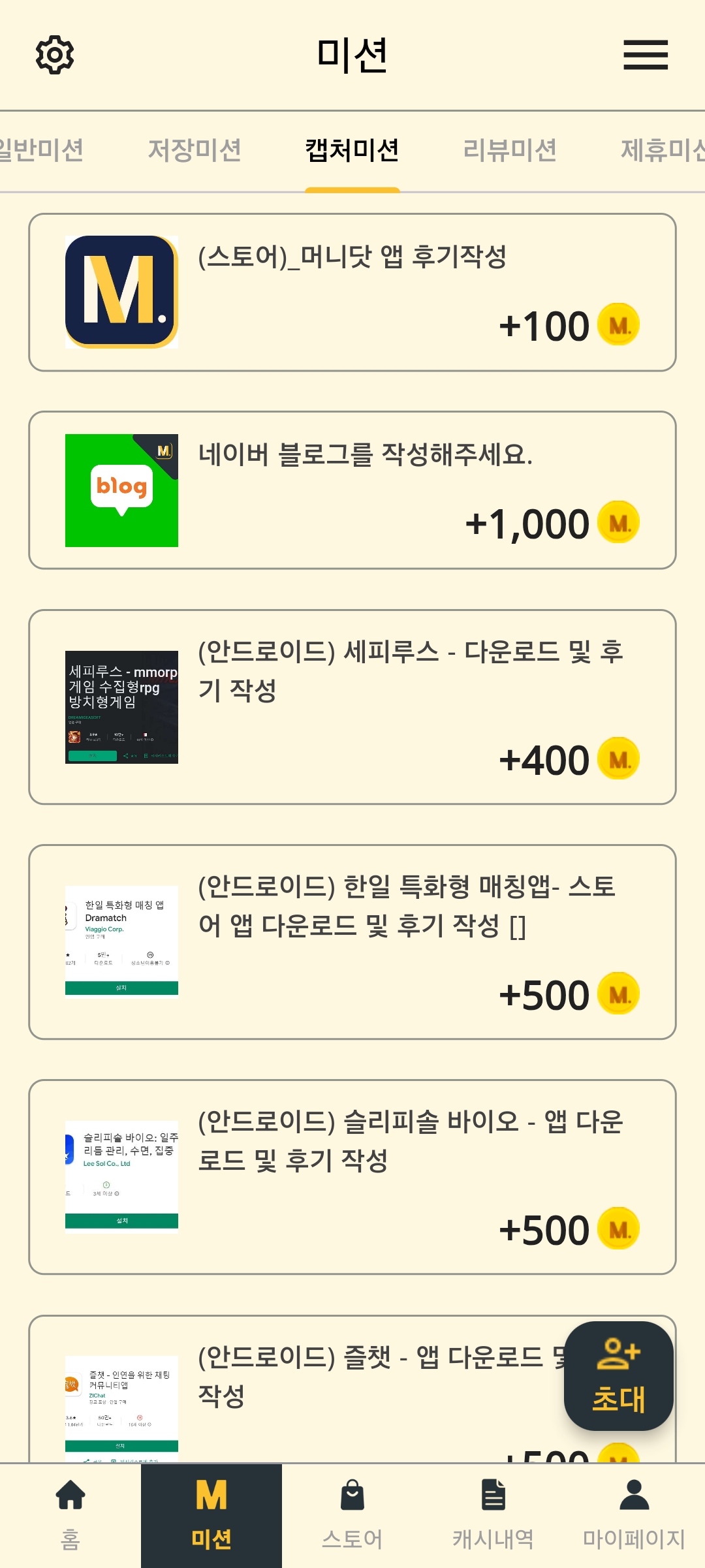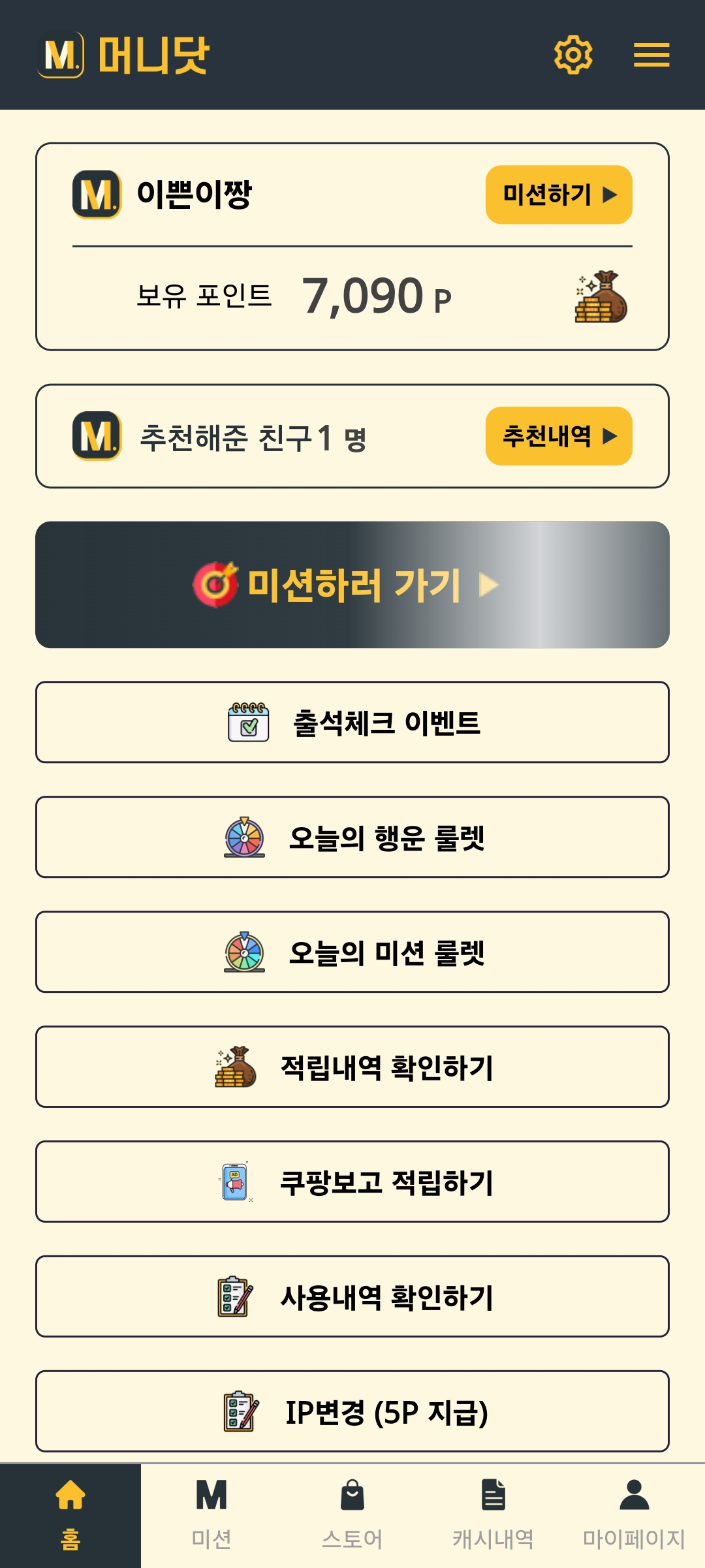 - 머니닷과 제휴한 업체들의 미션을 수행하는 유형입니다.