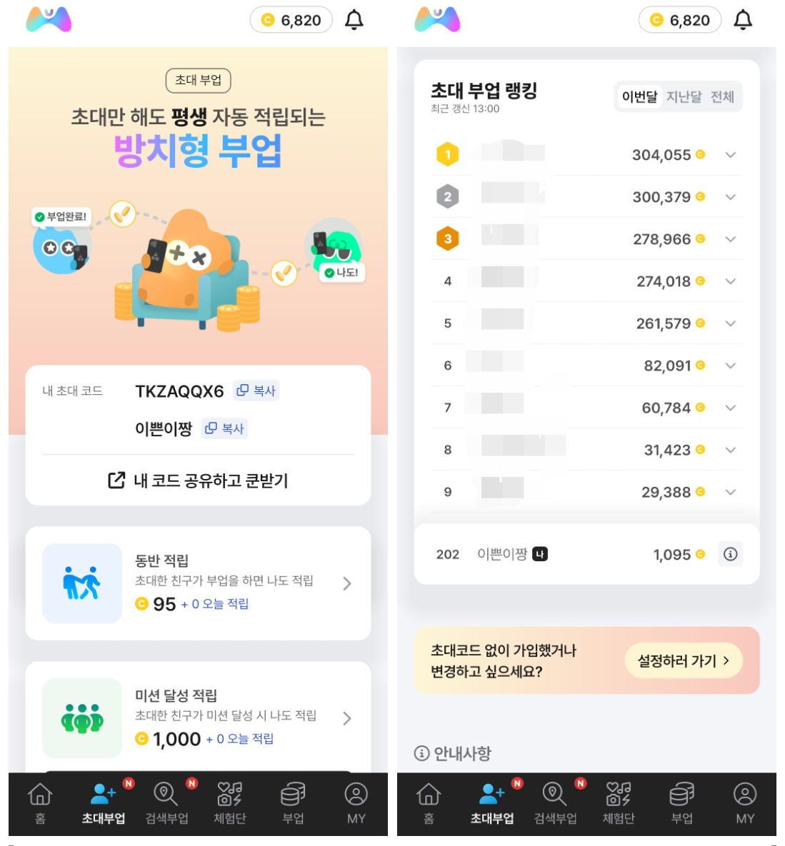 참고로 아래 링크를 클릭 가입을 하신 후 반드시 '검색부업' 10회를 하시면 축하금 1,000원이 지급 됩니다. 당연히 링크를 통해 가입하는것이 이익이겠죠?