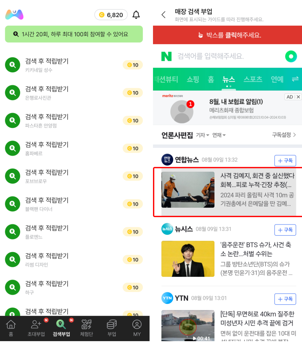 복잡해서 그걸 어떻게 하나? 이렇게 생각할 수 있는데 머니쿤은 친절하게도 네이버 화면으로 넘어가면 빨간 네모박스로 클릭할 곳을 가르쳐 주기 때문에 그대로 따라서 클릭 몇 번 하면 30초 이내로 끝나며 바로 10~15원씩 적립이 됩니다. 하루 100개까지 적립이 가능합니다.