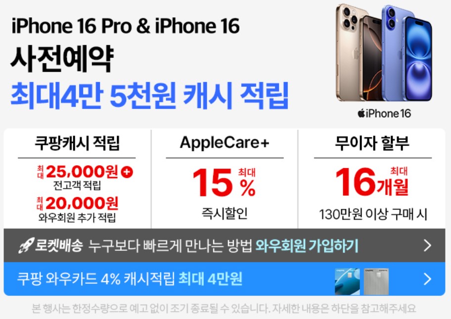 이처럼 쿠팡에서 아이폰16을 사전예약하면 다양한 혜택을 누릴 수 있습니다. 높은 캐시백, 애플케어플러스 할인, 빠른 배송, 편리한 결제 시스템 등 쿠팡만의 장점들이 아이폰16 구매를 더욱 매력적으로 만들어주고 있죠.