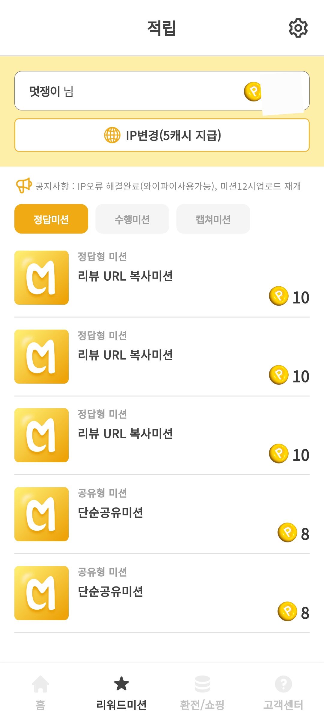 - 검색하기 미션(정답미션): 10포인트